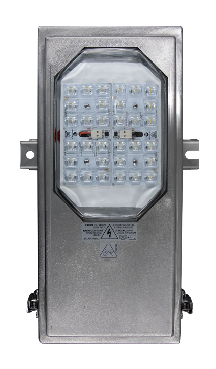 Armaturen er konstruert i syrefast rustfritt stål 316L med C5M korrosjonsbestandighet, noe som gjør den svært godt egnet i miljøer med høy fuktighet, smuss og korrosiv belastning. Fronten er utført i 5 mm formstøpt, herdet sikkerhetsglass, og armaturen har IP66 kapslingsgrad samt IK08 slagfasthet for høy motstand mot støv, vann og mekanisk påvirkning.